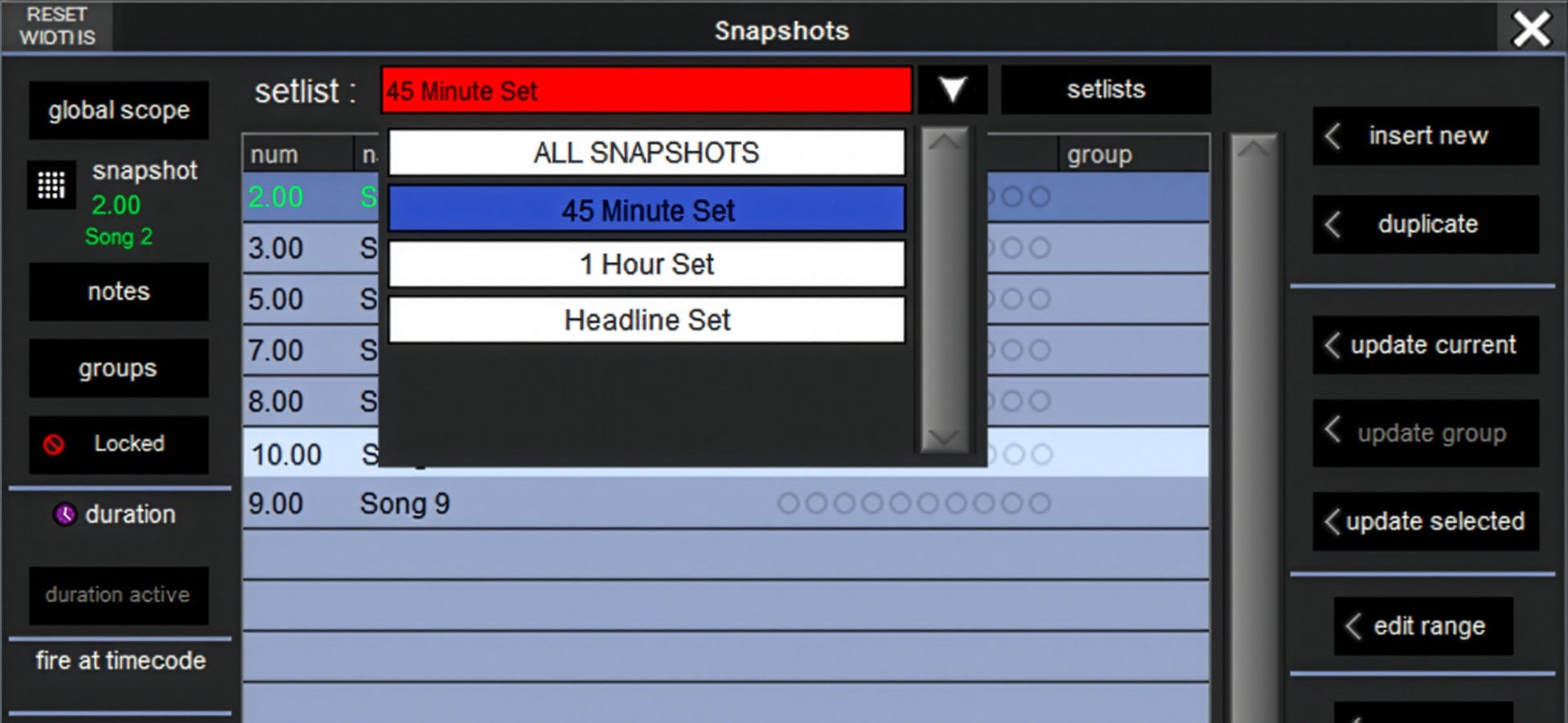 Further set lists can then be created and snapshots added and removed from these. The console will then only recall snapshots in the current setlist. Snapshots in set lists can be in a different order to the All Snapshots list and the console will fire through them in this custom order. As a real-world example, during festival season, an act may change the length of its set each day, prompting the audio engineer to create specific 45-minute, hour-long, and headlining setlists for easy show selection.