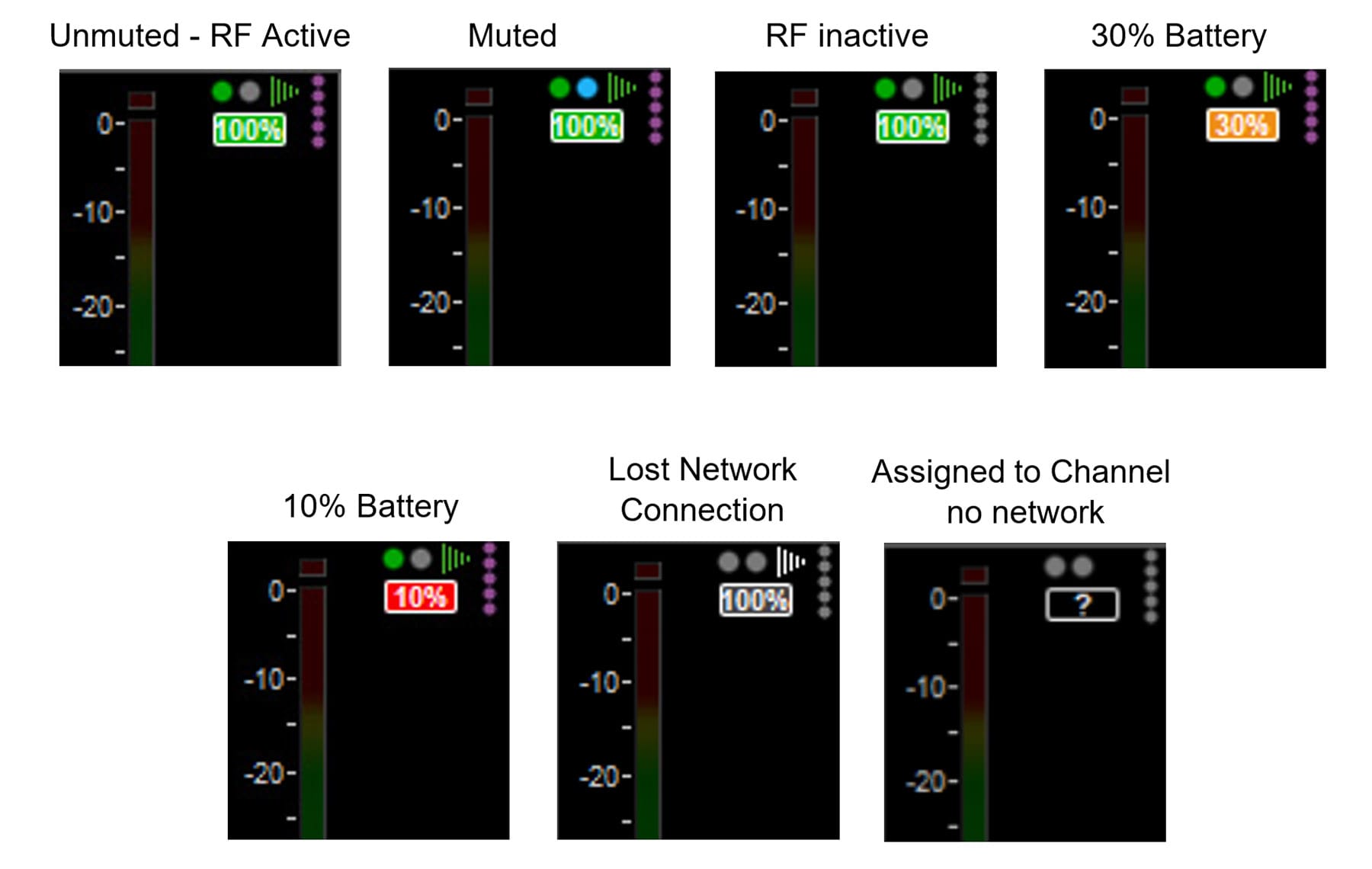 If these sockets are then routed to a channel, data from the Astral receiver, including Battery level, RF Quality level, NexLink signal strength, On/Off Status, and Mute Status are displayed at the top of the channel.